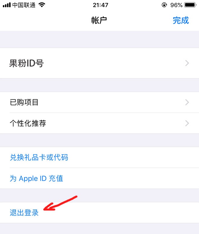 2:进入到“Appstore”软件后,点击右上角的小头像,然后将自己国内的ID账号退出登录 (注:ios13系统点击小头像进入后需要往下拉到最底部才能看到退出登录的按钮)